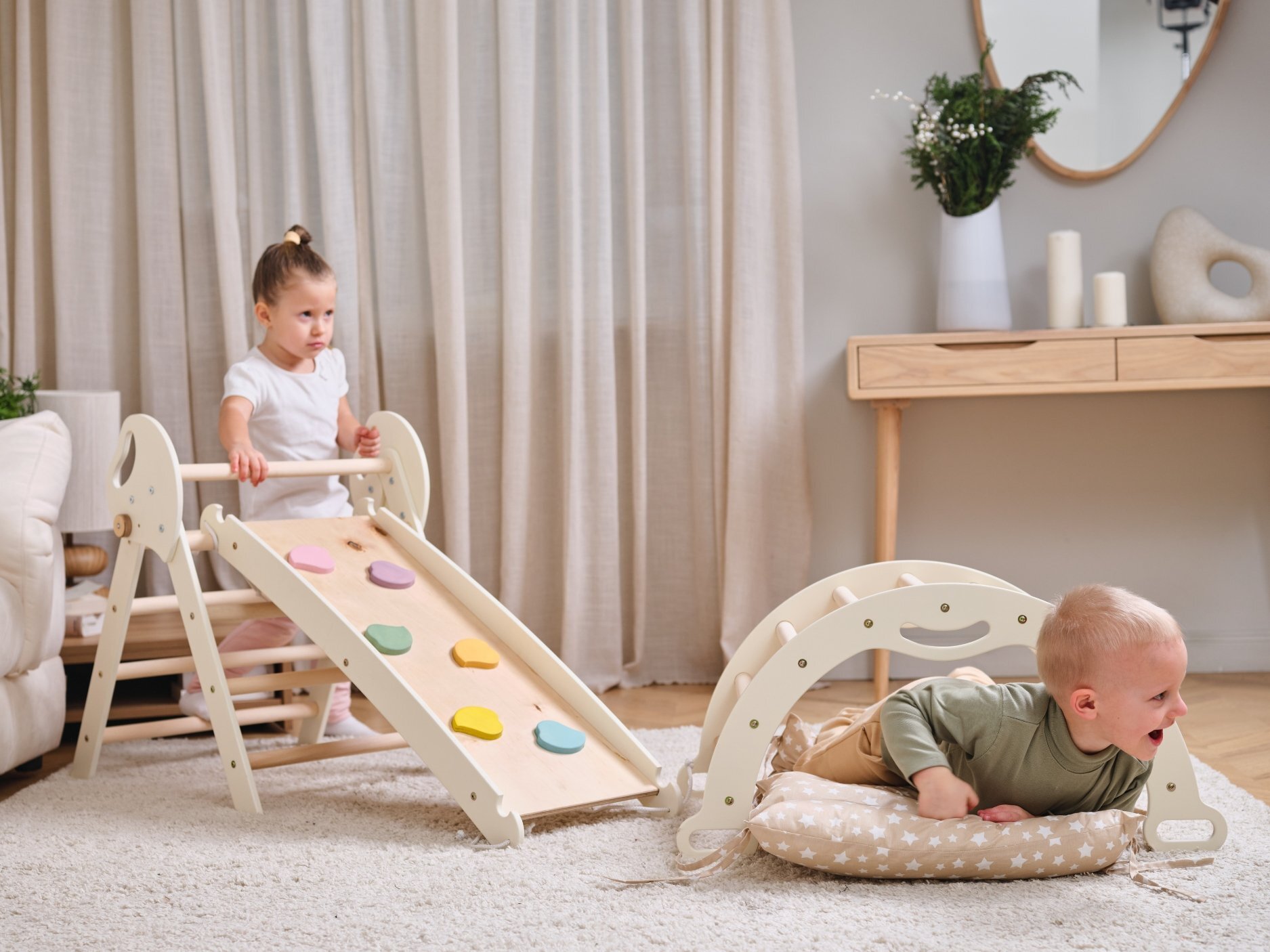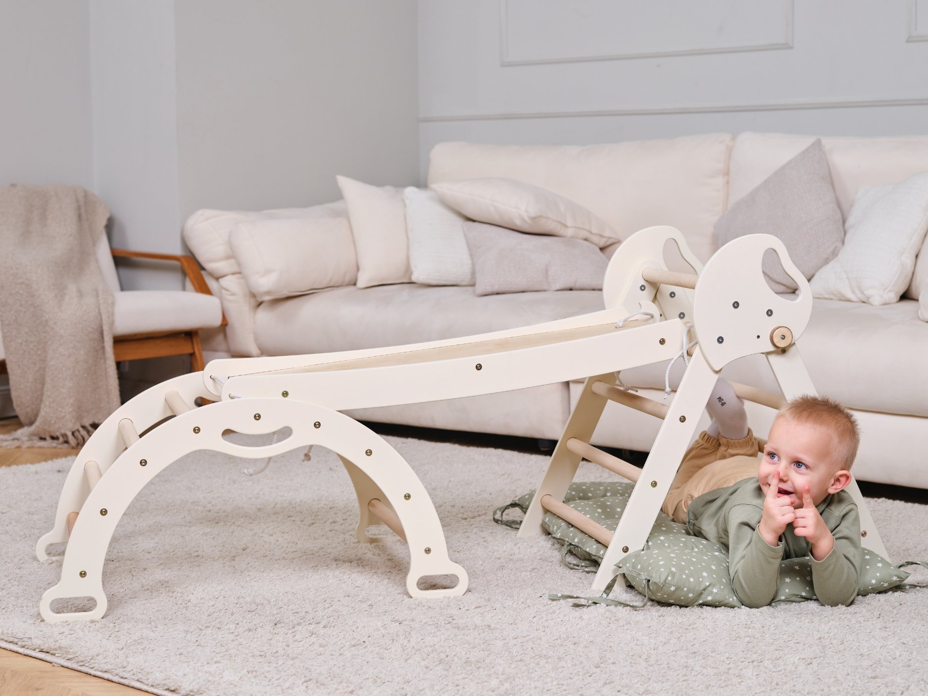 The 4-in-1 Montessori Climbing Set is a compact, eco-friendly play gym designed for toddlers aged 1–3. It includes a Pikler triangle, climbing arch, slide board, and soft cushion to support active, imaginative play. This versatile set promotes motor skills, balance, strength, and coordination while encouraging confidence and independence. Perfect for small spaces, it combines safe materials with Montessori principles to support healthy physical and cognitive development.