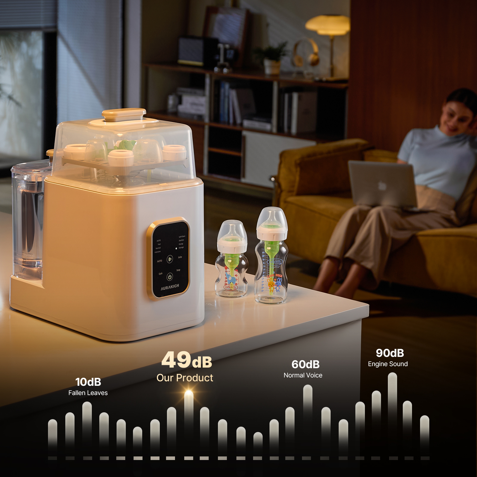 AURAKICH All-in-One Baby Bottle Washer, Sterilizer & Dryer – The ultimate automated cleaning solution for parents. This professional 4-in-1 machine washes, sterilizes, dries, and stores baby essentials, including baby bottles, breast pump parts, pacifiers, sippy cups, and even baby toys. It’s easy to use with a smart one-touch AUTO Mode and is safe for all bottle materials, including plastic, glass, and silicone. Engineered for performance, it features a revolutionary fishbone spray arm that delivers a powerful, deep clean, making handwashing with a bottle brush obsolete. It effectively cleans complex items like Dr. Brown bottles, wide-mouth/wide-neck bottles, and glass baby bottles.