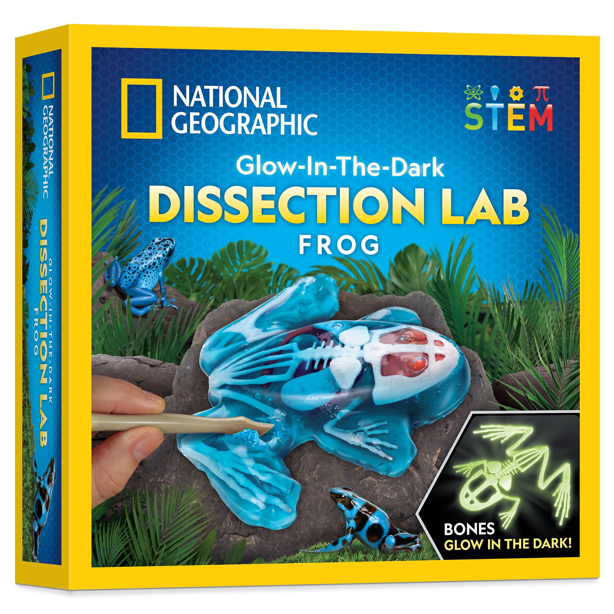 The National Geographic Frog Dissection Lab Kit is a safe and humane alternative to dissecting a real frog! The glow-in-the-dark bones and realistic organs are encased in a safe, odor-free gel. Kids use the included tools to extract each of the 11 anatomy pieces to study closer. The organ pieces include the brain and eyes, lower organs, stomach, heart, and lungs, and the skeleton components (skull, spine, front & back legs, pelvis) glow in the dark, making this biology kit truly unique and fun! With the included gel refill, kids can reassemble their frog and refill it to conduct another dissection, making this kit perfect for biology classrooms and homeschool lessons!