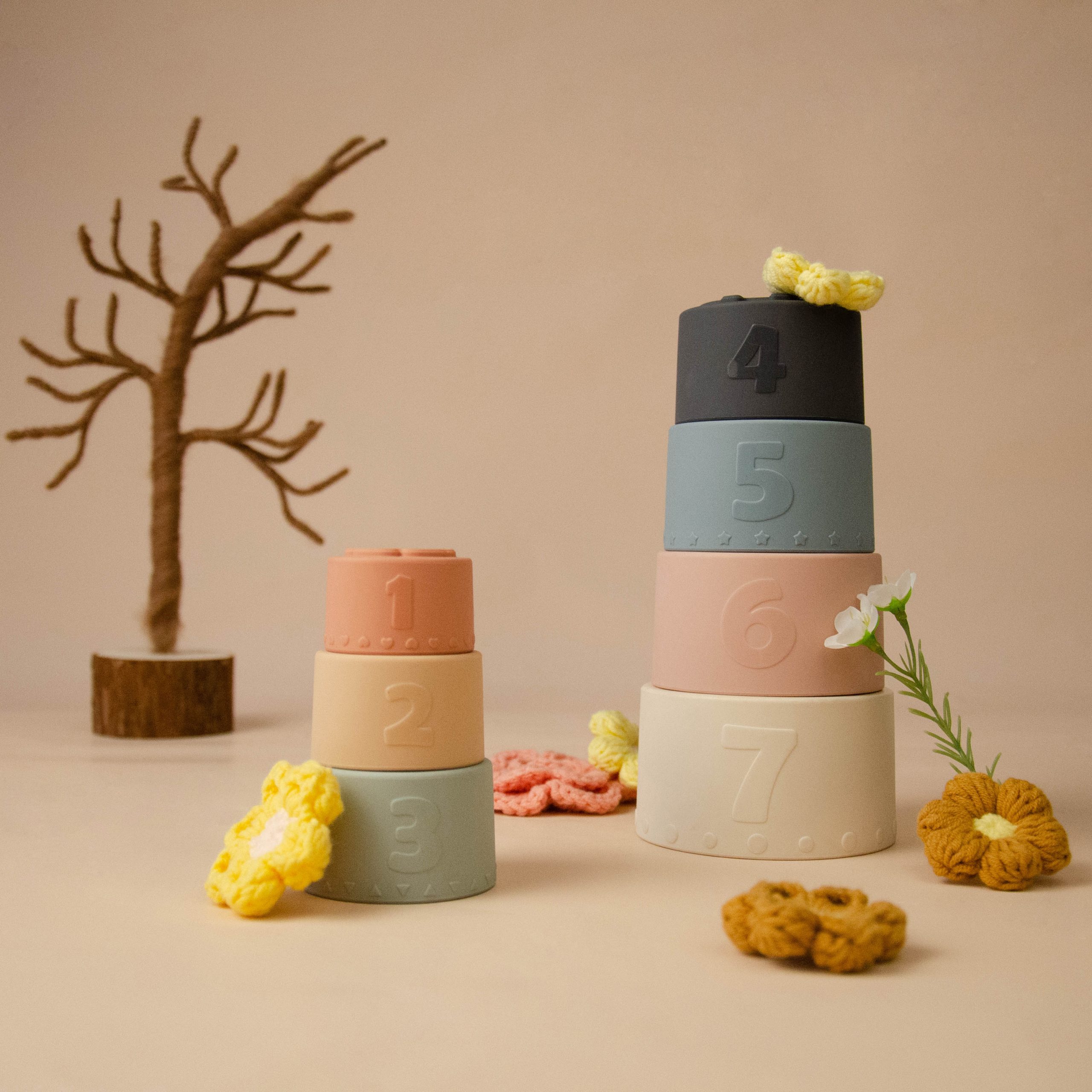 Moonkie 7 Silicone Stacking Cups have different top patterns have exquisite strokes, which enrich the touch of hand-touched patterns. 7 different colors attract baby’s attention and promote visual development. Stacking cups also help kids learn language and fine motor skills. Our stacking cups provide different textures, shapes, and sizes of modeling combinations, which are soft and chewable, suitable for babies to chew.