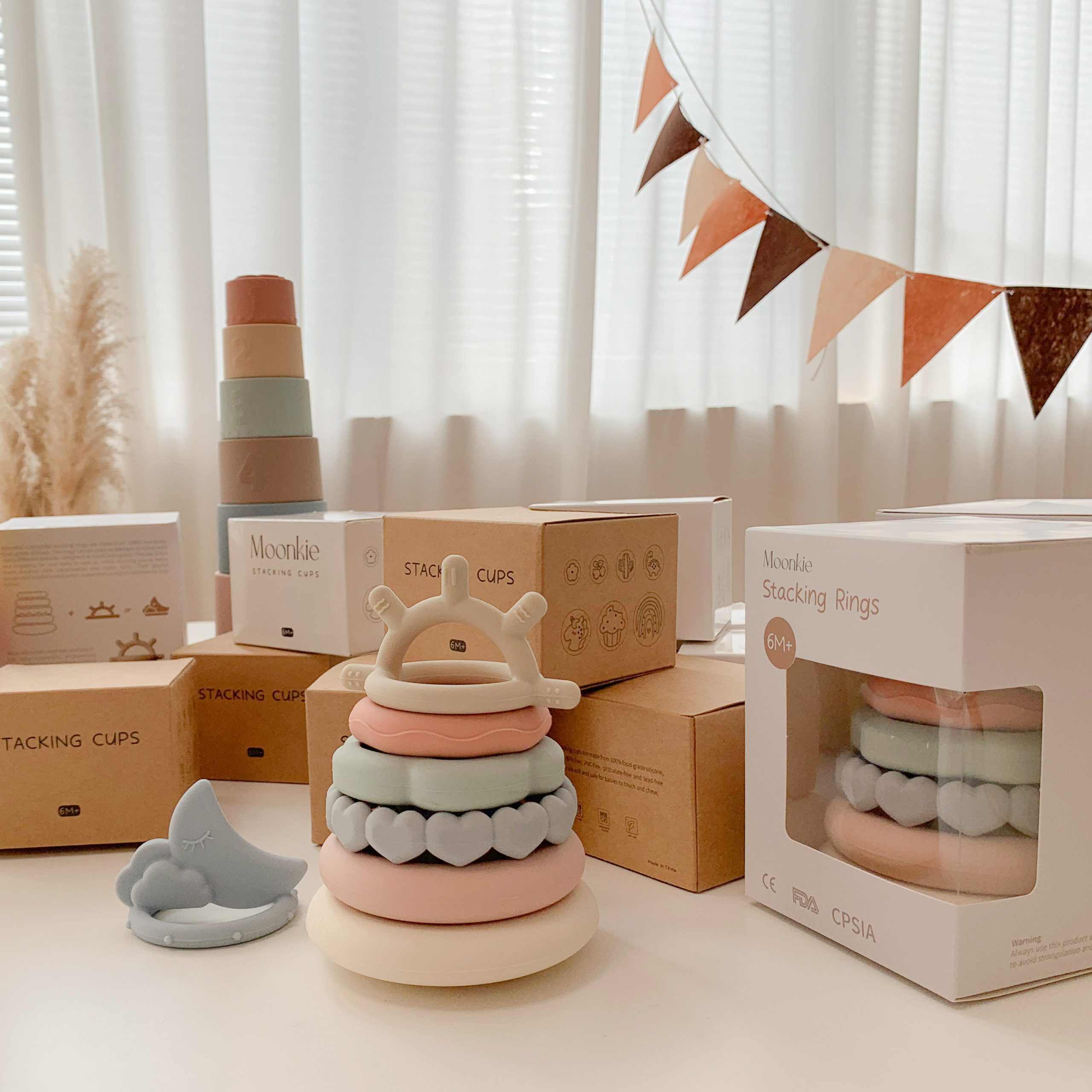 Moonkie Stacking Rings come in 7 pieces with different shapes and sizes , providing more choices for your baby to explore. They are also soft, chewable and portable, making them perfect for on-the-go playtime. Our stacking toys are designed to help develop fine and gross motor skills in babies. As they play and learn to stack the rings, they also develop their problem-solving and hand-eye coordination skills, which will be useful for more complex tasks like writing.