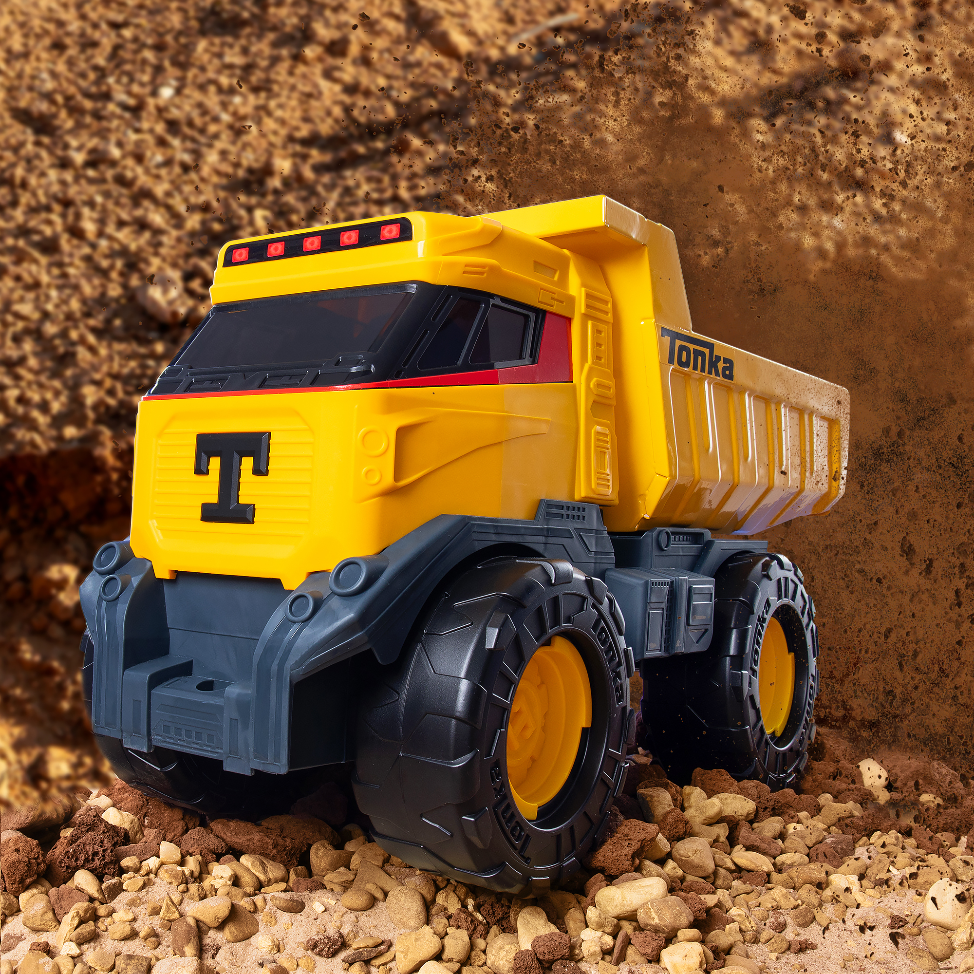 Meet the next evolution of toughness with TONKA Next Gen Mighty Dump Truck. Designed for the roughest play and the biggest jobs, this truck is built TONKA TOUGH with more stamped steel than ever before, giving it the muscle to haul, dump, and dominate. Its articulated steel dump bed is ready to unload massive payloads with ease, and features safe touch edges so kids can play hard without holding back. From backyard quarries to driveway construction zones, the pneumatic mega wheels with rugged Tonka tread chew up the terrain and keep on rolling. This beast is more than just brawn—it’s built for action. Front and rear towing connections mean it’s always ready to pull—or be pulled—into the next big mission. And with a bold, modern look, it’s not just strong—it looks the part too.