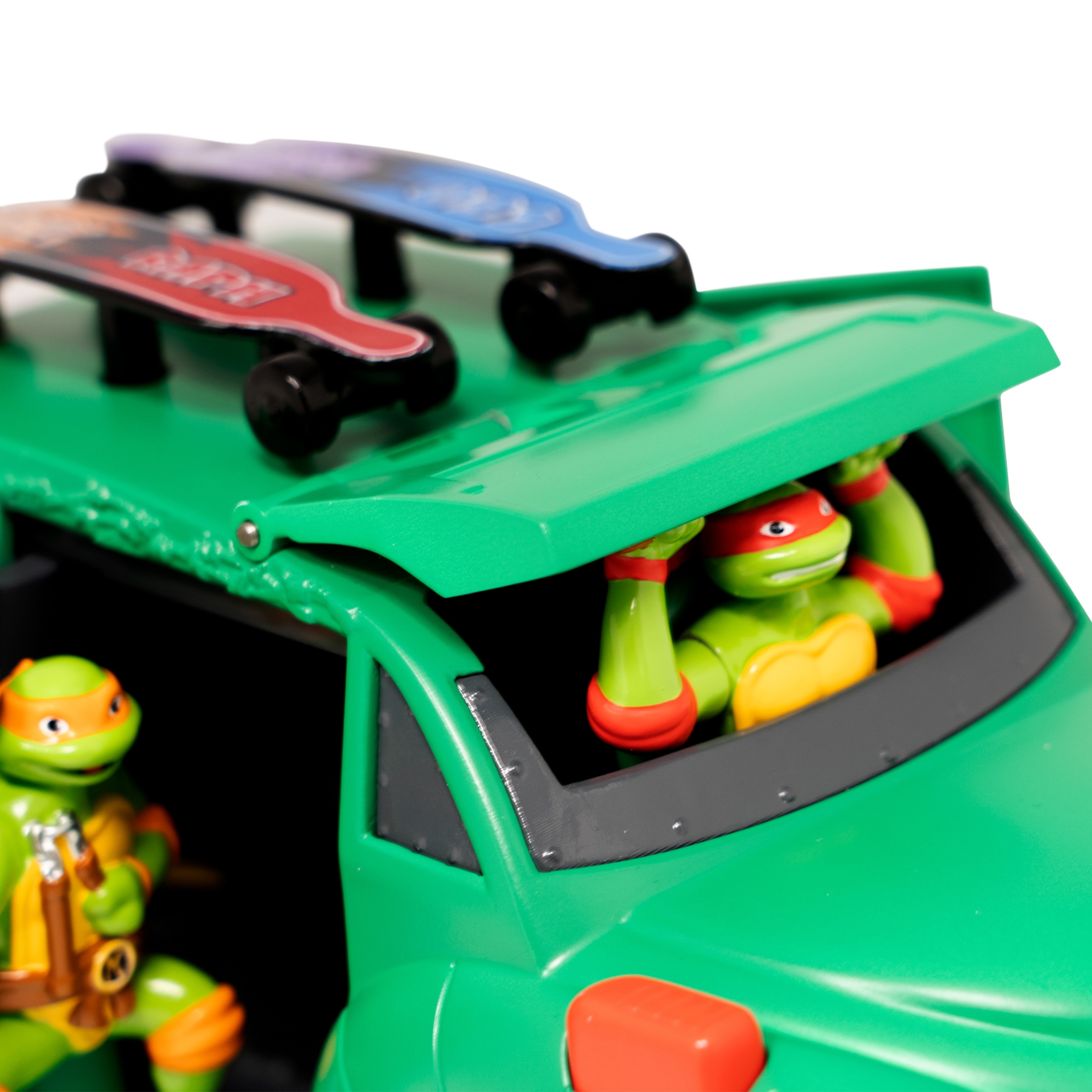 Turtle Party Cruiser is a vintage “Woodie” style vehicle that comes equipped with long boards on top, featuring the signature colors of your favorite Turtles. Press down on each longboard color to activate the Turtles popping out of the car – Leonardo, Michelangelo, Donatello, and Raphael. Each turtle also delivers a unique catchphrase! Plus, watch as lights illuminate the action with every push of a button, adding to the excitement of the Turtle Party Cruiser experience!